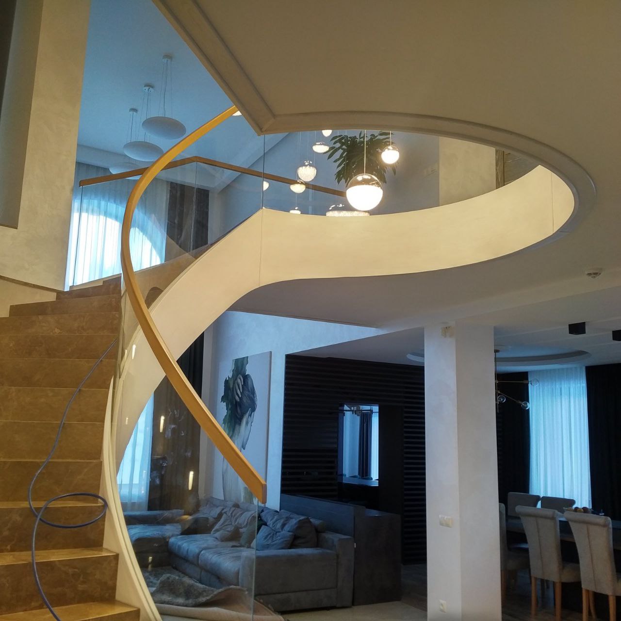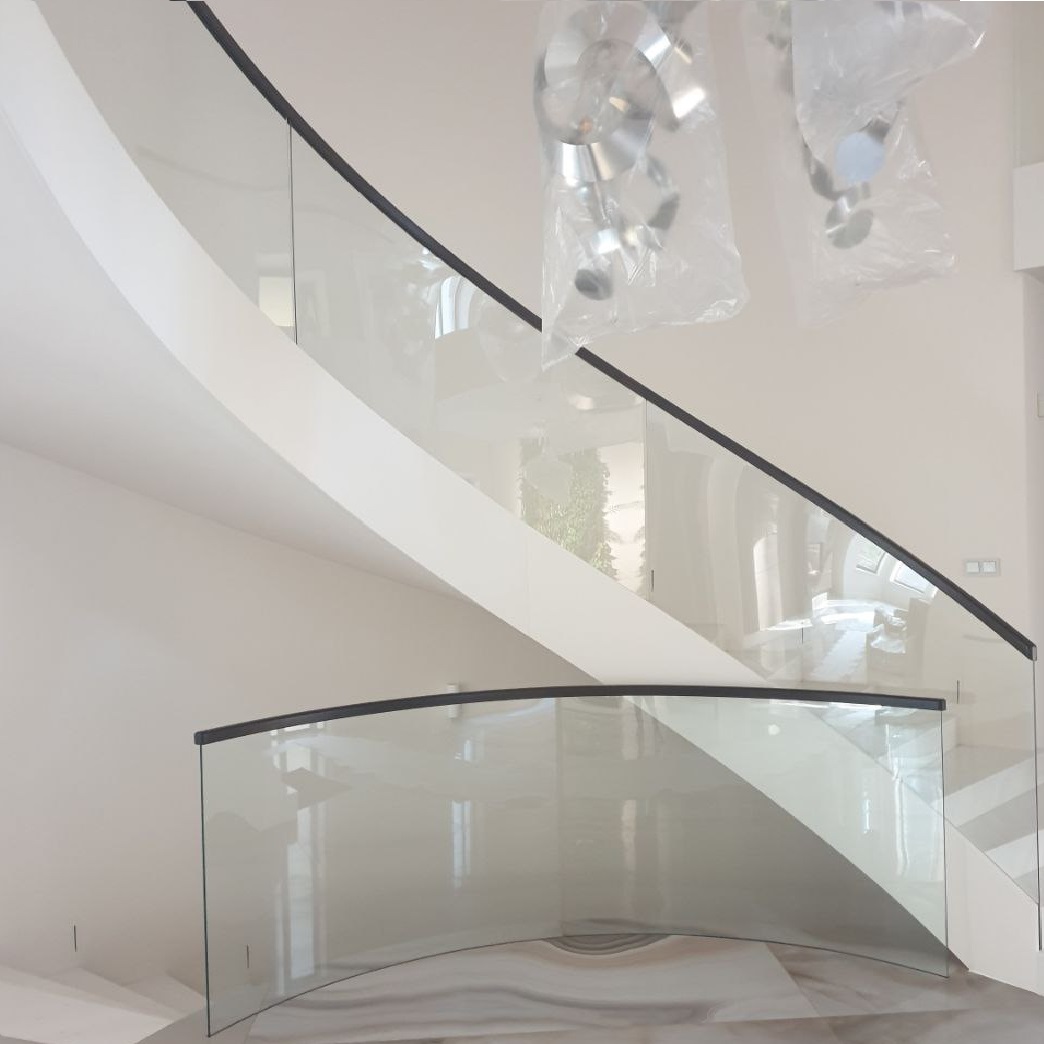 Скло проходить термічне гартування після формування, що гарантує високу міцність, ударостійкість і довговічність. Радіусна форма робить огородження максимально ергономічним, без різких кутів, що особливо важливо для приватних будинків, готелів, ТРЦ та представницьких просторів.
