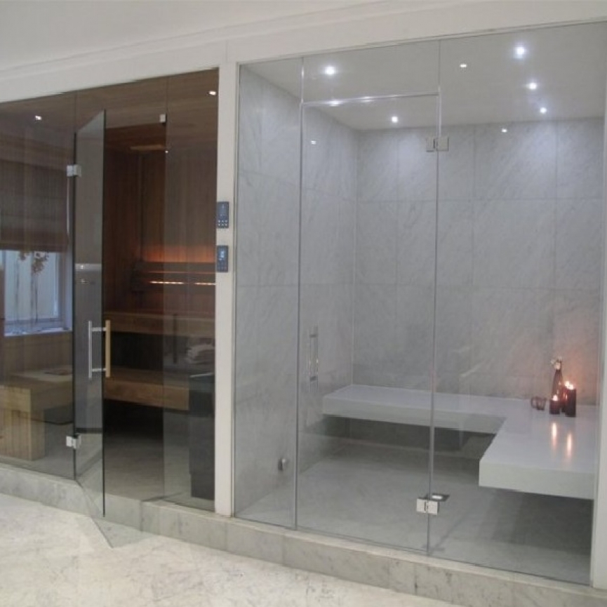 - Друге це гігієна. Скляна перегородка в сауні не вбирає запахи, не накопичує вологу у товщі матеріалу і легко очищується.