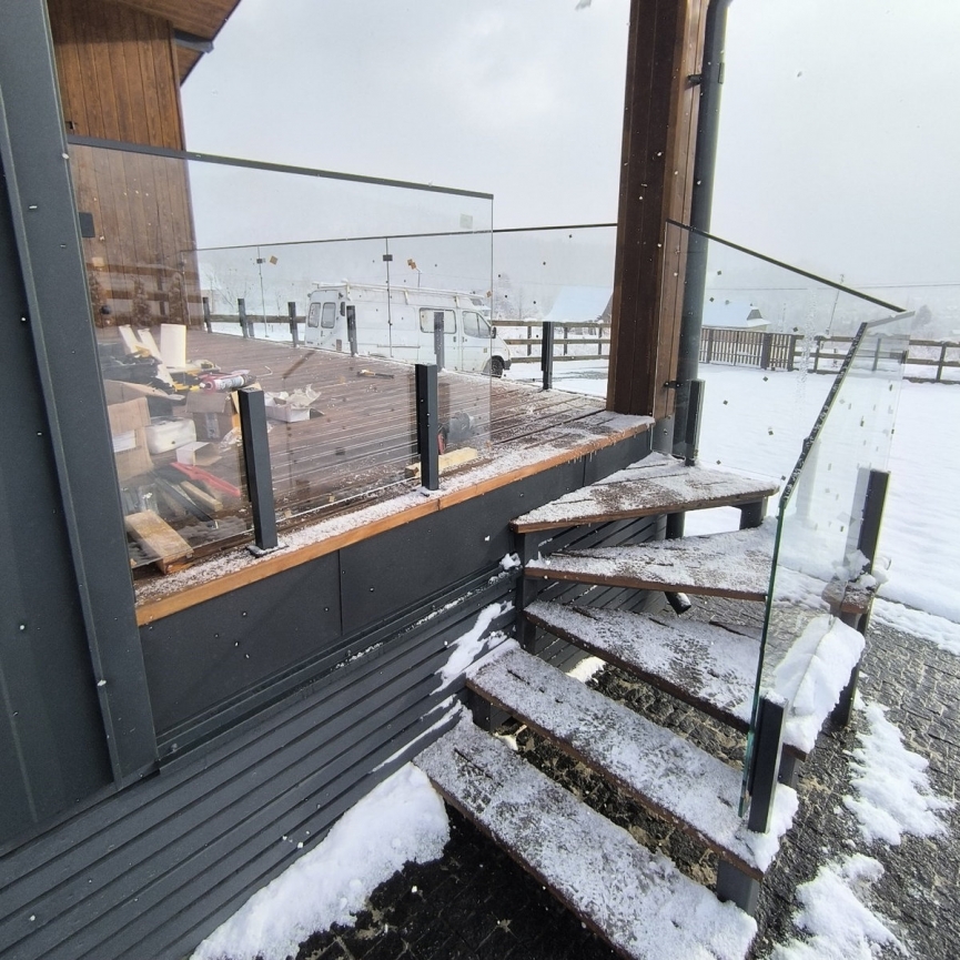 Верх огородження завершений поручнем, встановленим прямо на скло. Поручень не лише додає конструкції жорсткості, а й забезпечує комфортне використання. Він виконує роль верхньої окантовки та робить огородження візуально завершеним.