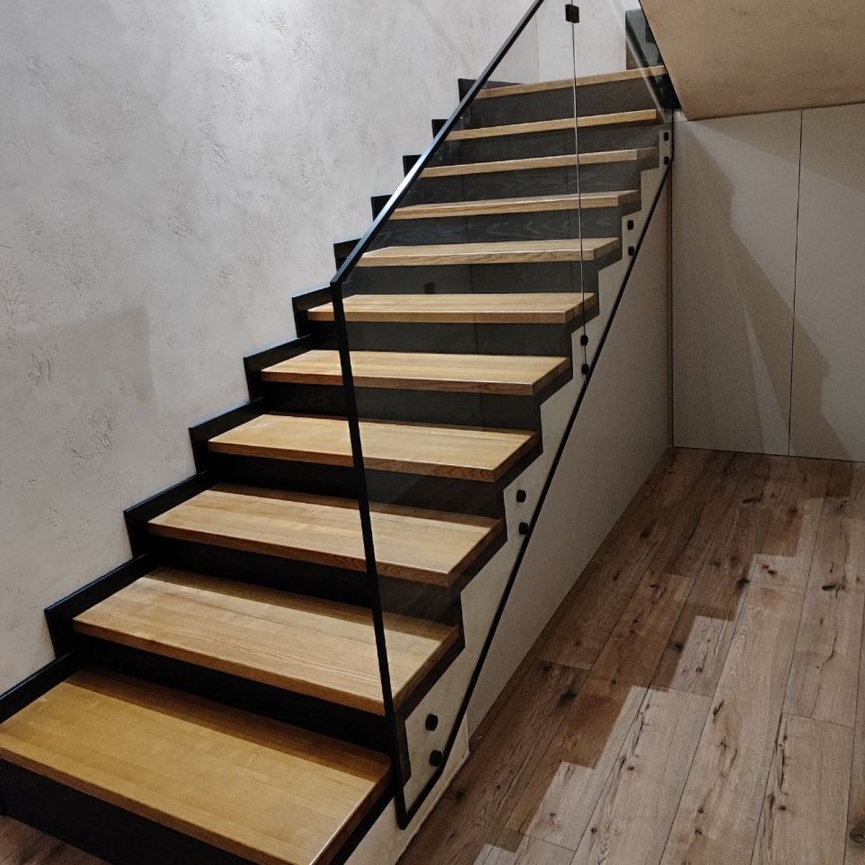 Важливим елементом є поручень, встановлений безпосередньо поверх скла. Такий варіант підсилює жорсткість конструкції та підвищує комфорт користування сходами. Поручень створює завершений вигляд і забезпечує правильний хват при підйомі та спуску.