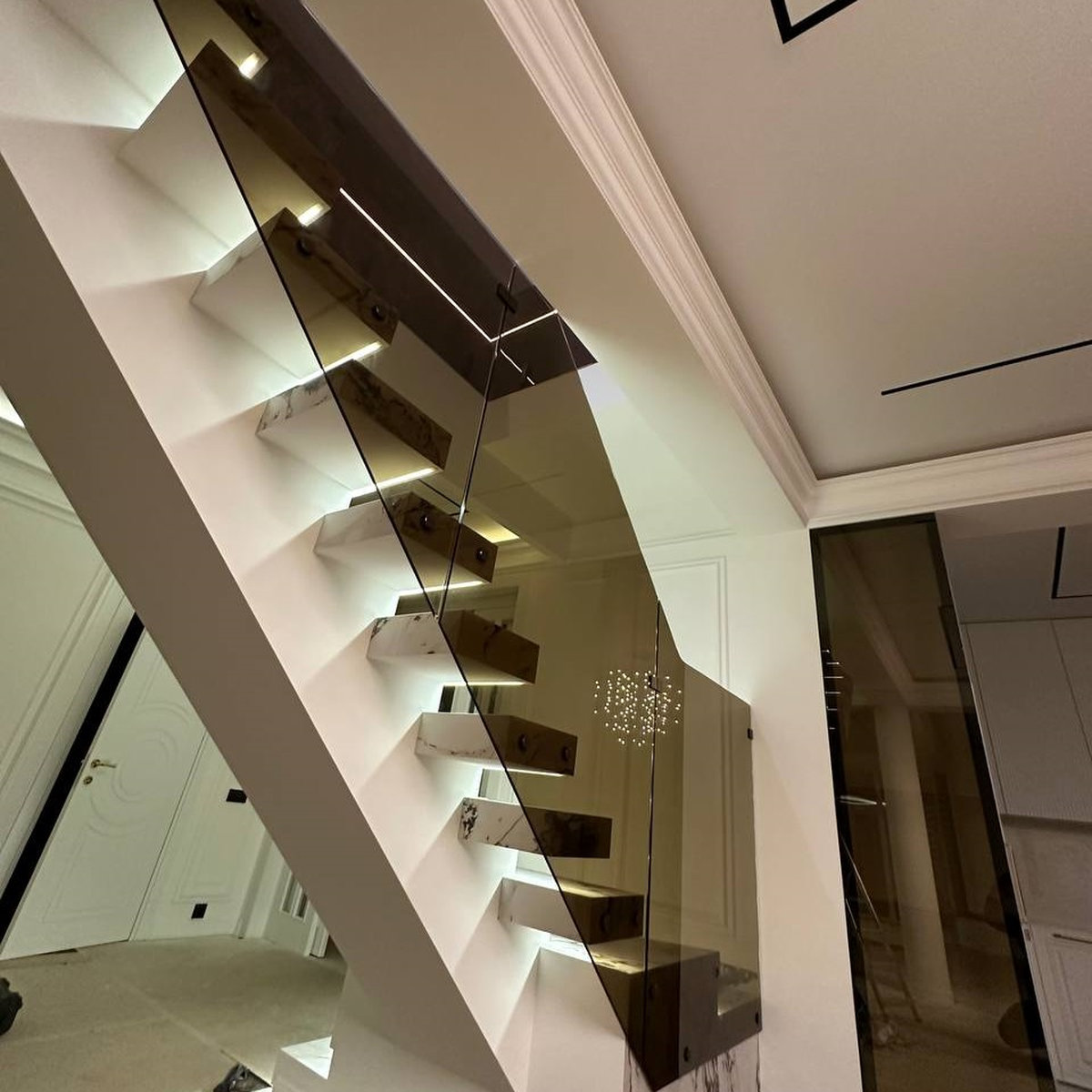 На сходовому марші використане інше рішення — точкове торцеве кріплення збоку сходинки. Це дозволяє залишити простір максимально відкритим, без вертикальних стійок і профільних елементів. Скло ніби “плаває” вздовж сходів, підкреслюючи мінімалізм і витонченість конструкції.