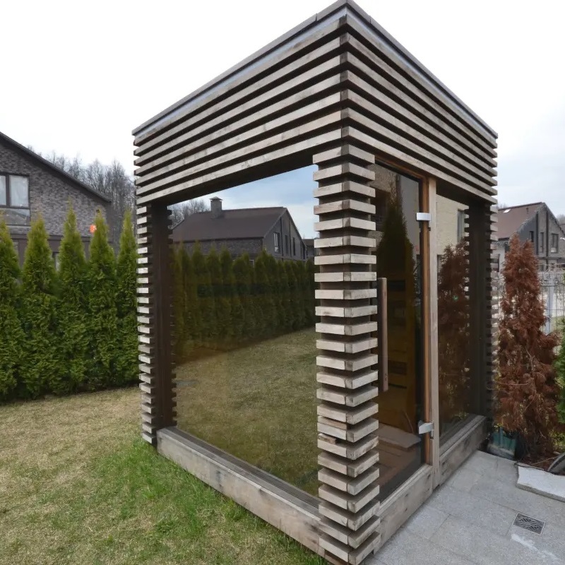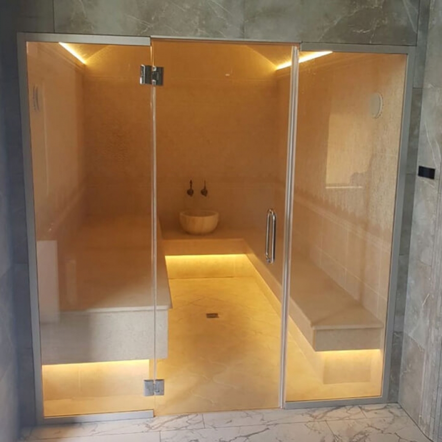 Скляні стіни створюють відкритий простір, забезпечують природне освітлення й роблять інтер’єр сауни максимально сучасним. Конструкції можуть бути виконані у прозорому, матовому, бронзовому або графітовому варіанті.