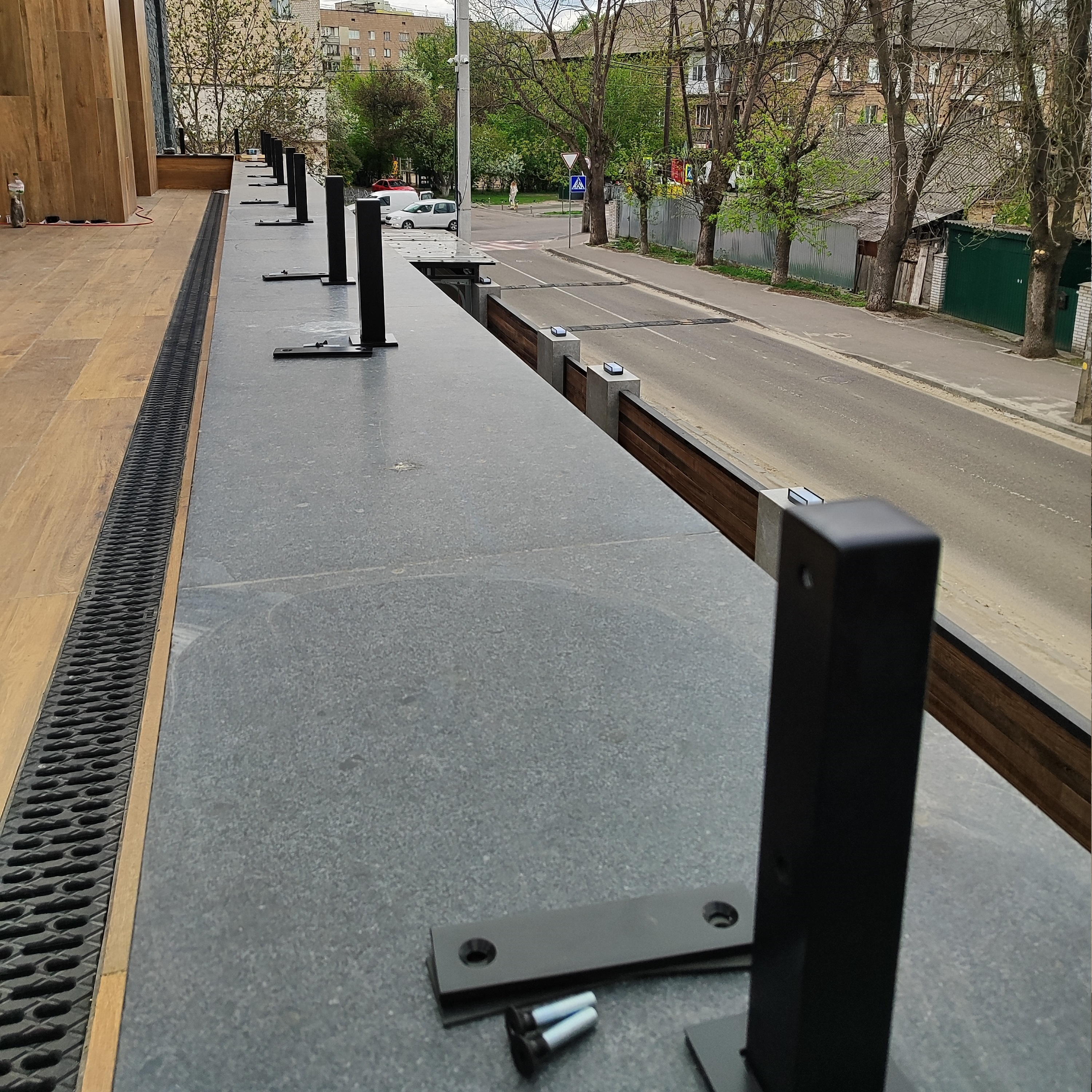 Чорні матові стійки та поручень виглядають максимально сучасно та ідеально підходять до фасадів у кольорах антрацит, білий, графіт, дерево або бетон. Порошкове фарбування забезпечує захист металу від корозії та стирання. Така система добре переносить зовнішню експлуатацію та довго зберігає естетичний вигляд.