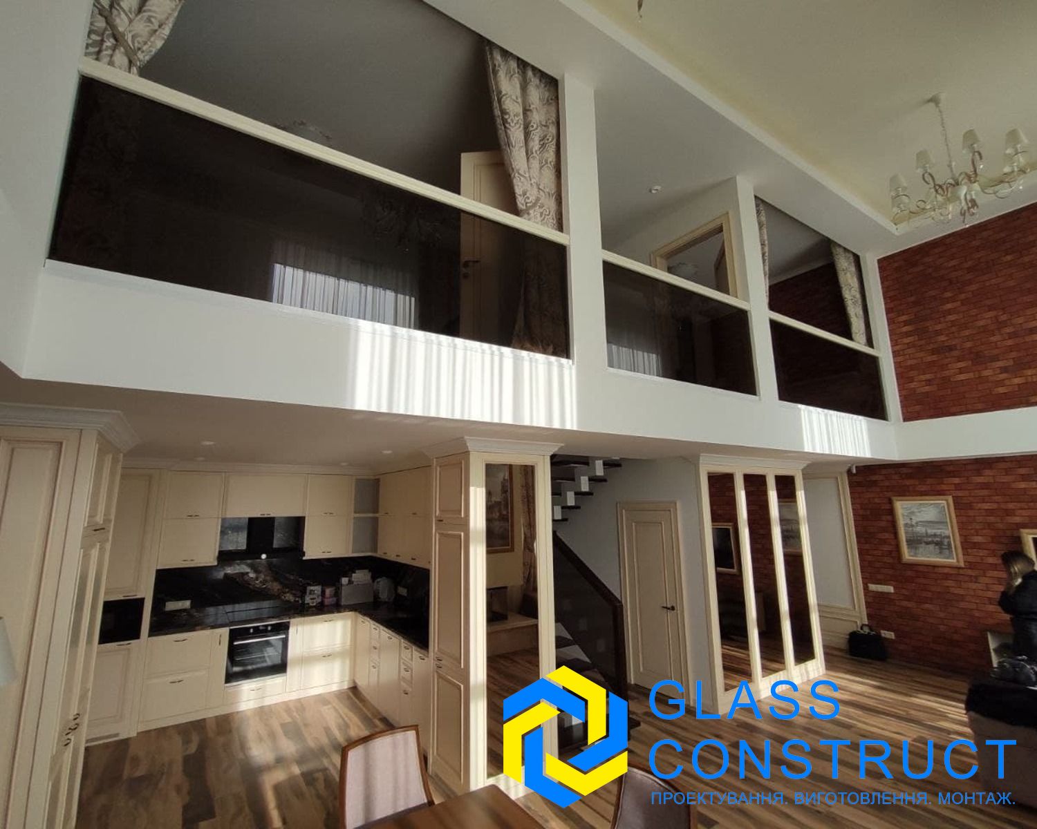 Скляний парапет на верхньому поверсі забезпечує безперешкодний огляд між рівнями. А якщо вам подобається ще більше прозорості, ми можемо виготовити для Вас скляні сходи.