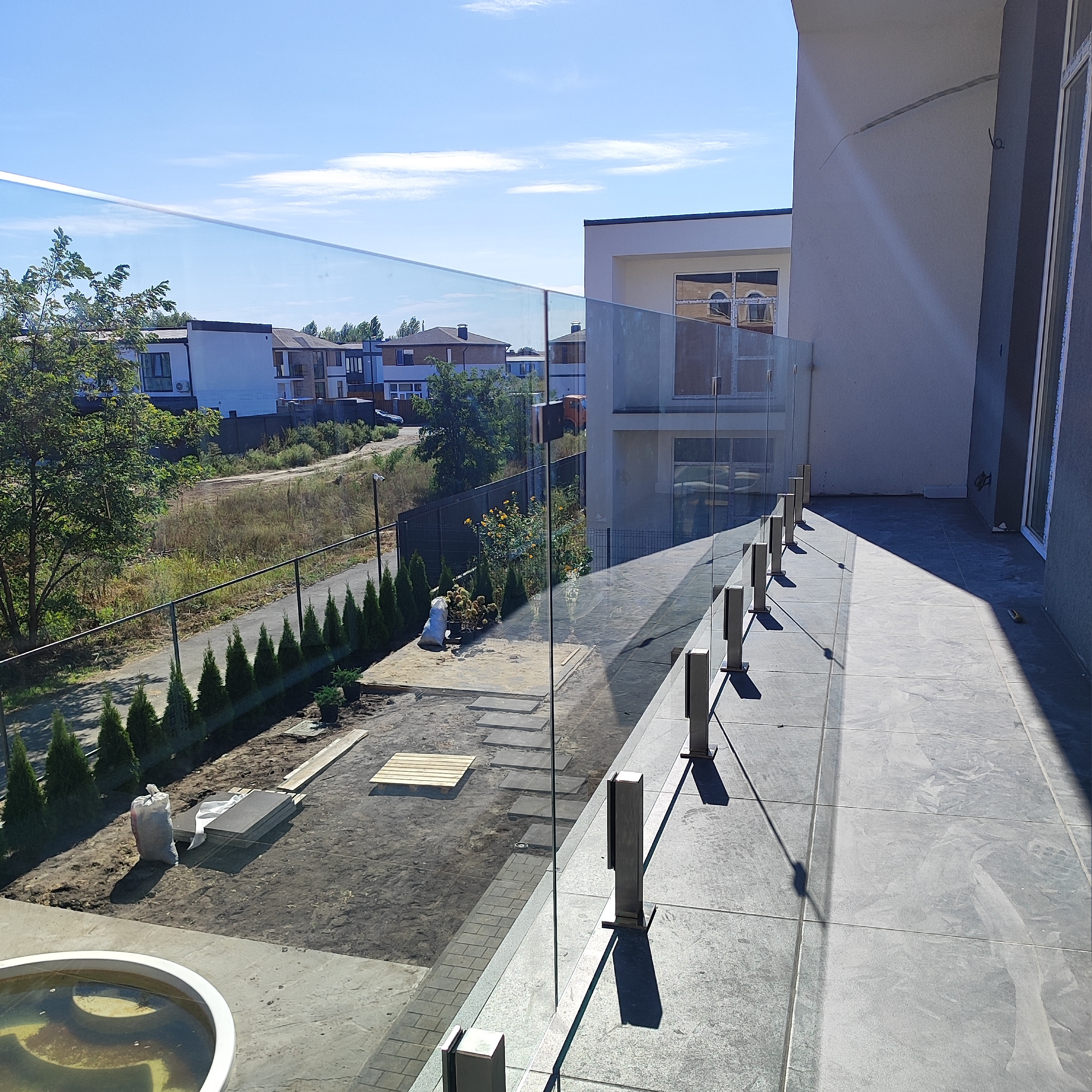 Пряме скляне огородження балкона з прозорого скла на стійках 250 мм з нержавійки — Oristano