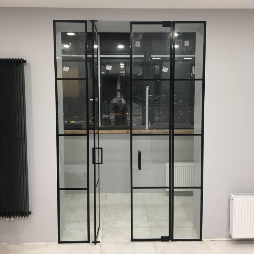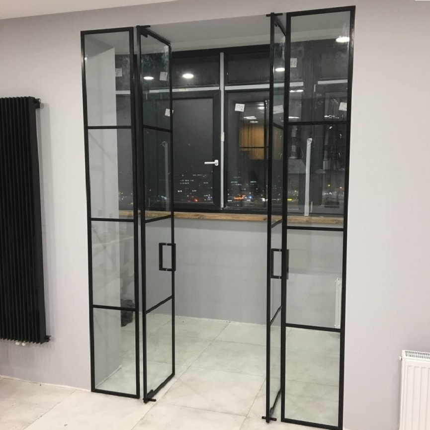 Перегородка “Tivenys” состоит из четырёх секций, включая две маятниковые двери с петлями, закреплёнными в полу и потолке. Эффектная и функциональная, подходит для масштабных межкомнатных зонирований, переговорных, галерей и open space помещений. Петли с доводчиком обеспечивают мягкий ход створок.