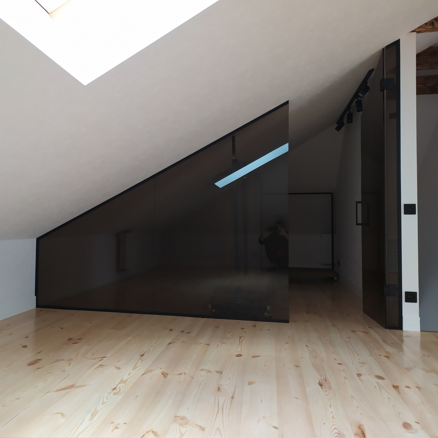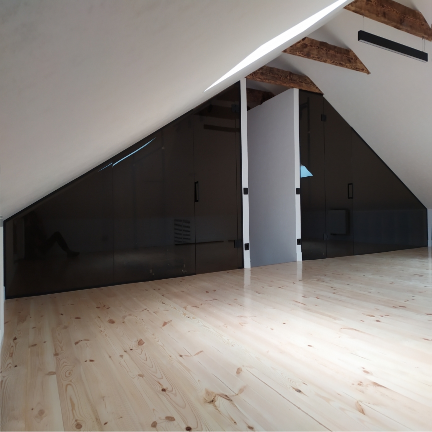 Двойная LOFT перегородка “Sabiote” со стеклом графит — идеальное решение для оформления гардеробной под скатом мансардного этажа. Плотное закалённое стекло с тонировкой в массе обеспечивает приватность, а двойная конструкция создаёт полноценное зонирование. Благодаря прочному алюминиевому профилю перегородка устойчива и эстетична. Прекрасный выбор для современных интерьеров с наклонной геометрией.