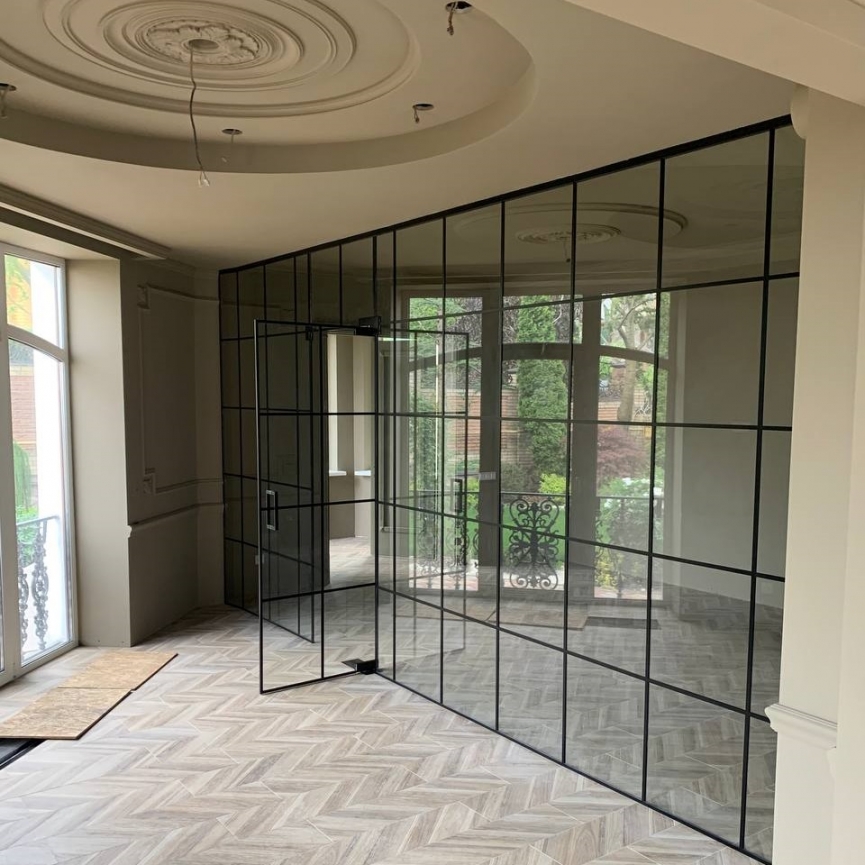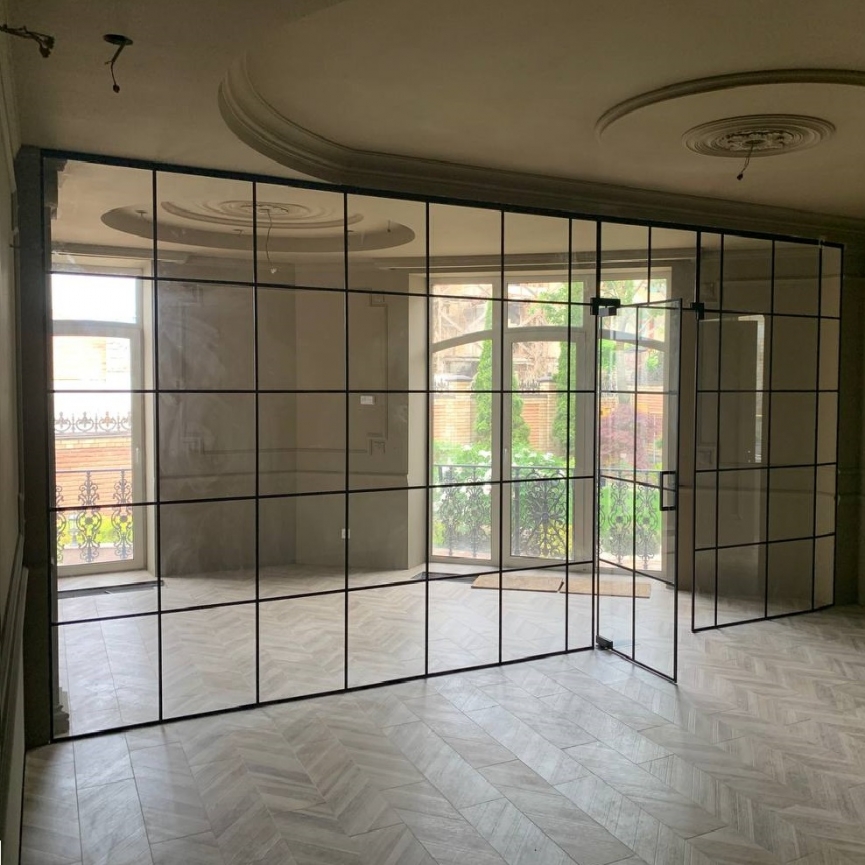 Перегородка “Navia” — межкомнатное решение с маятниковыми стеклянными дверями, врезным доводчиком и декоративными алюминиевыми полосами. Дизайн подчеркивает стиль loft и добавляет выразительную геометрию. Подходит для переговорных, холлов, студий и квартир с открытым пространством. Система открывается в обе стороны.