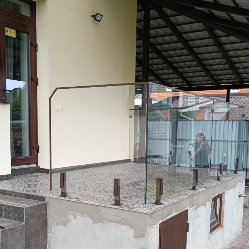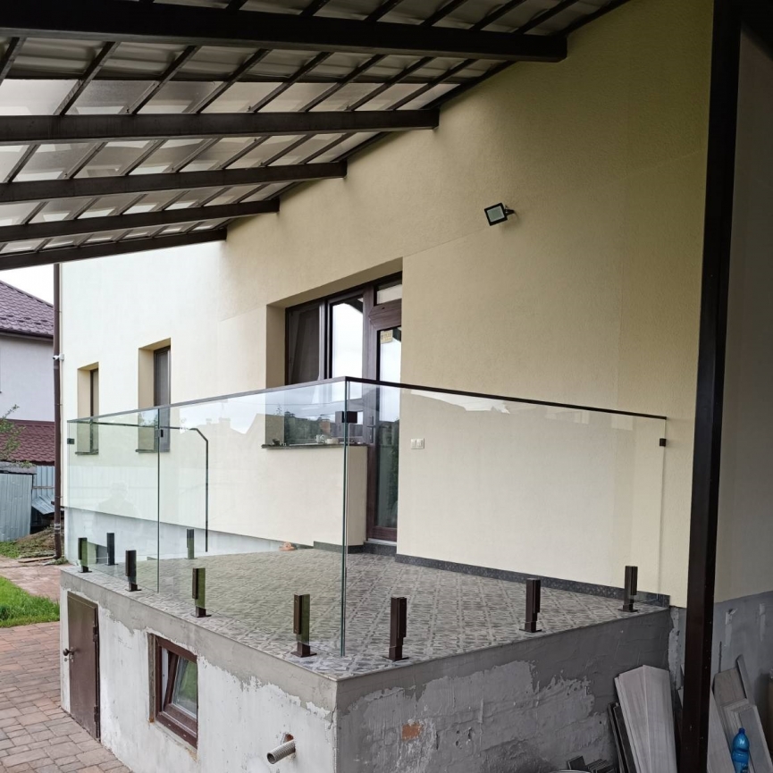 В конструкции используется прозрачное закалённое стекло толщиной 8–12 мм, устойчивое к ветровым нагрузкам, ударам и атмосферному воздействию. Оно не мутнеет, не выгорает и сохраняет идеальную прозрачность в течение многих лет эксплуатации.