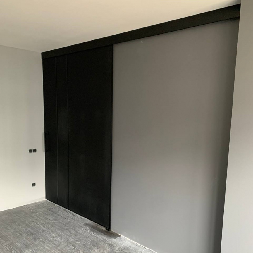 Дверь “Montoro” выполнена из графит-матового стекла с декоративными импостами. Конструкция на верхнем подвесе, с креплением на стену. Импосты добавляют ритмичную структуру, профиль — чёрный, стекло — закалённое 8–10 мм. Отличное решение для зонирования с акцентом на стиль и лёгкость.