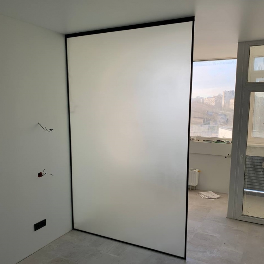 Перегородка “Oropesa” — стационарная конструкция из матового закалённого стекла толщиной 10 мм в чёрном алюминиевом профиле. Подходит для ванных комнат, санузлов, домашних кабинетов и студий. Матовое стекло эффективно рассеивает свет и обеспечивает приватность. Надёжное решение для современного минималистичного интерьера.