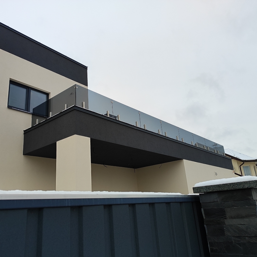 Стеклянное ограждение террасы из графитового стекла на парапете с нержавеющими стойками — это современная система ограждения, которая сочетает безопасность, долговечность и эстетичный внешний вид. В конструкции используется закалённое графитовое стекло, тонированное в массе, благодаря чему оно не выгорает и сохраняет оттенок на протяжении всего срока службы. Такое стекло снижает яркость солнечного света, создаёт комфортный уровень приватности и при этом не закрывает обзор.