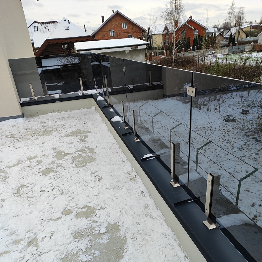 Стеклянное ограждение террасы из графитового стекла на парапете с нержавеющими стойками
