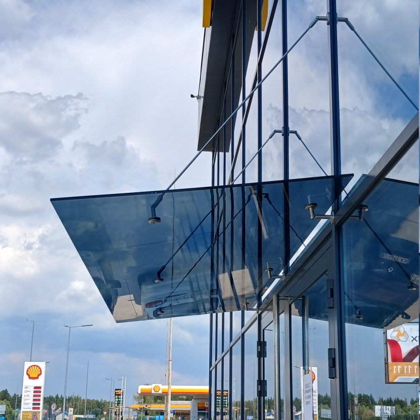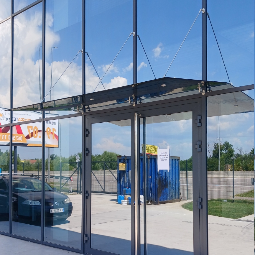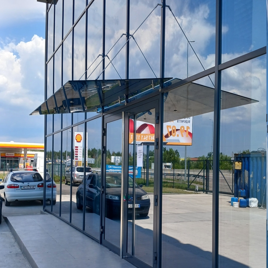 Стеклянный навес для коммерческого здания в фасадной системе из графитового стекла — Imola