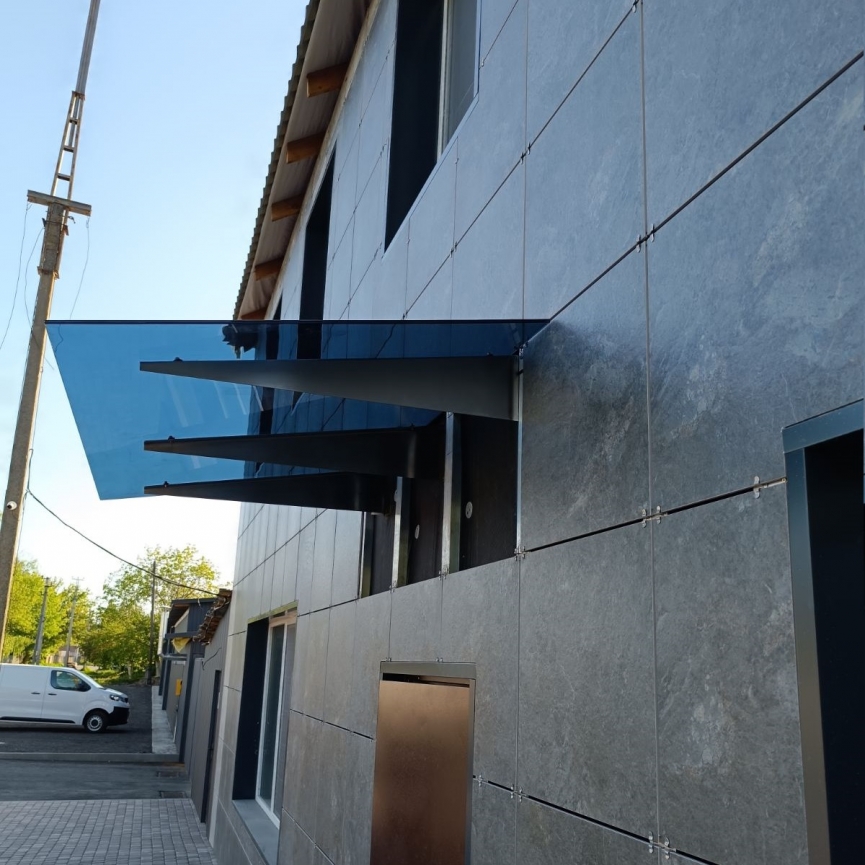 Используется закалённое стекло или триплекс, рассчитанный на наружную эксплуатацию. Чёрные матовые кронштейны с порошковой покраской подчёркивают строгую геометрию фасада и обеспечивают надёжную фиксацию навеса.