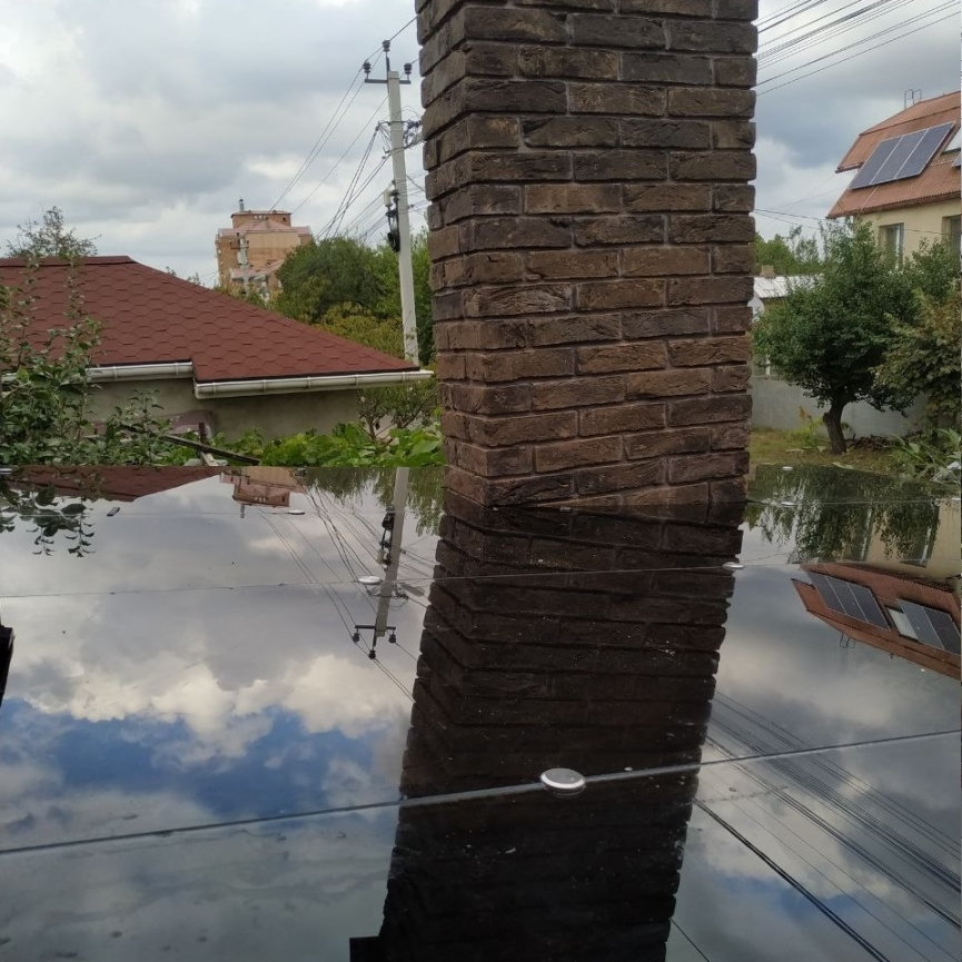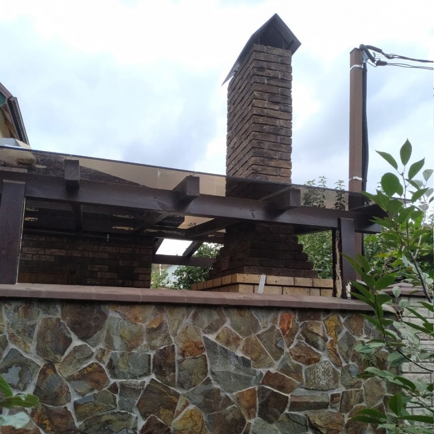Стеклянный навес на деревянном каркасе из графитового триплекса 5.15 с обходом дымохода — Sansepolcro