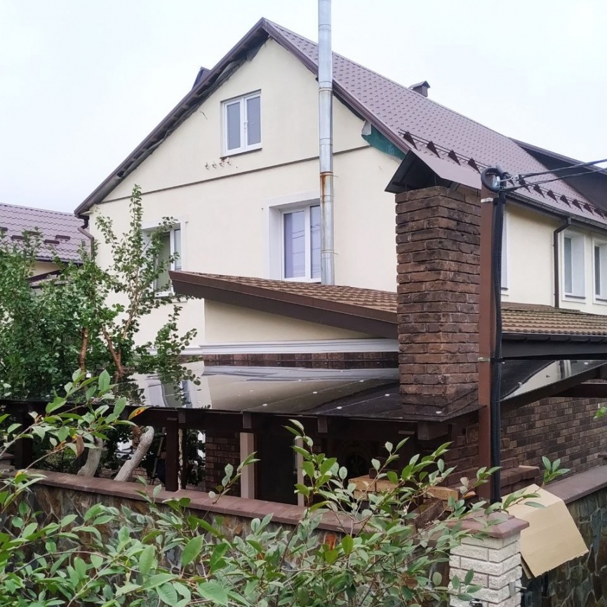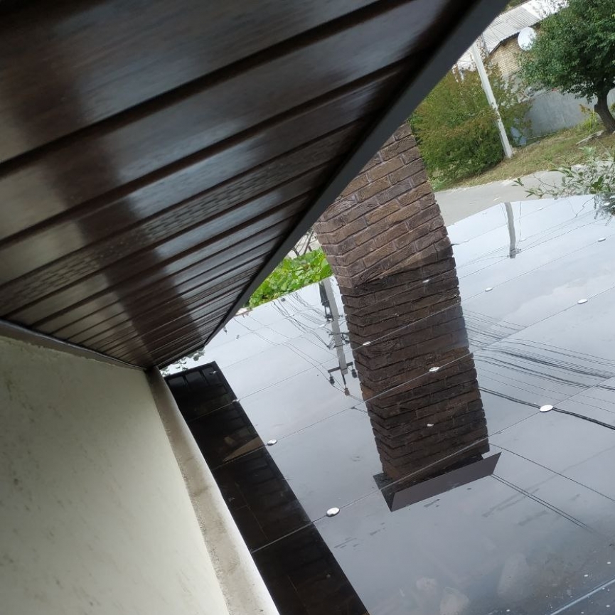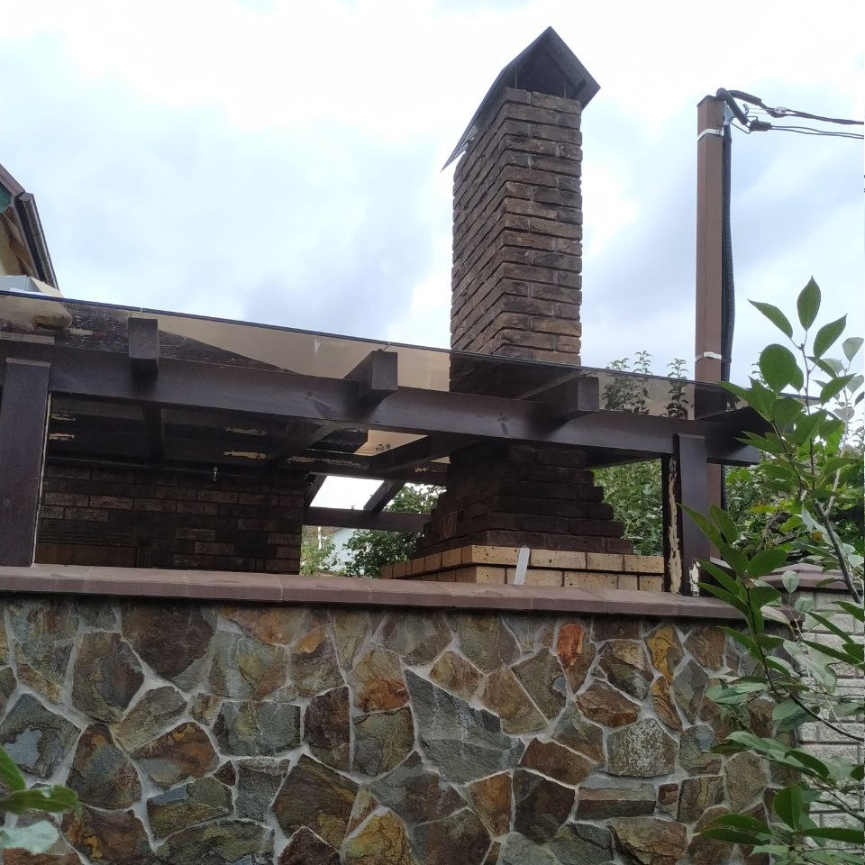 Ключевая особенность навеса — обход дымохода и трубы с герметичным примыканием к дому. Такие решения требуют точных расчётов и профессионального монтажа, что делает данный навес показателем высокого уровня исполнения.