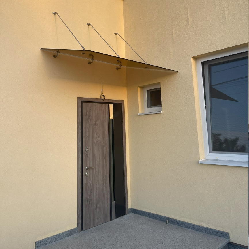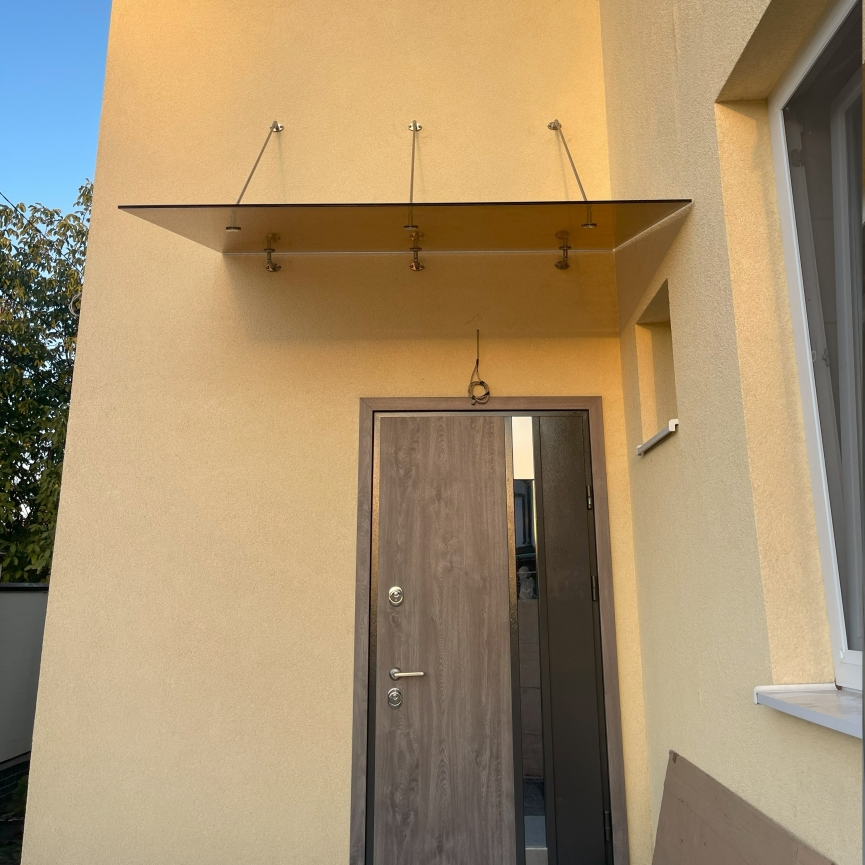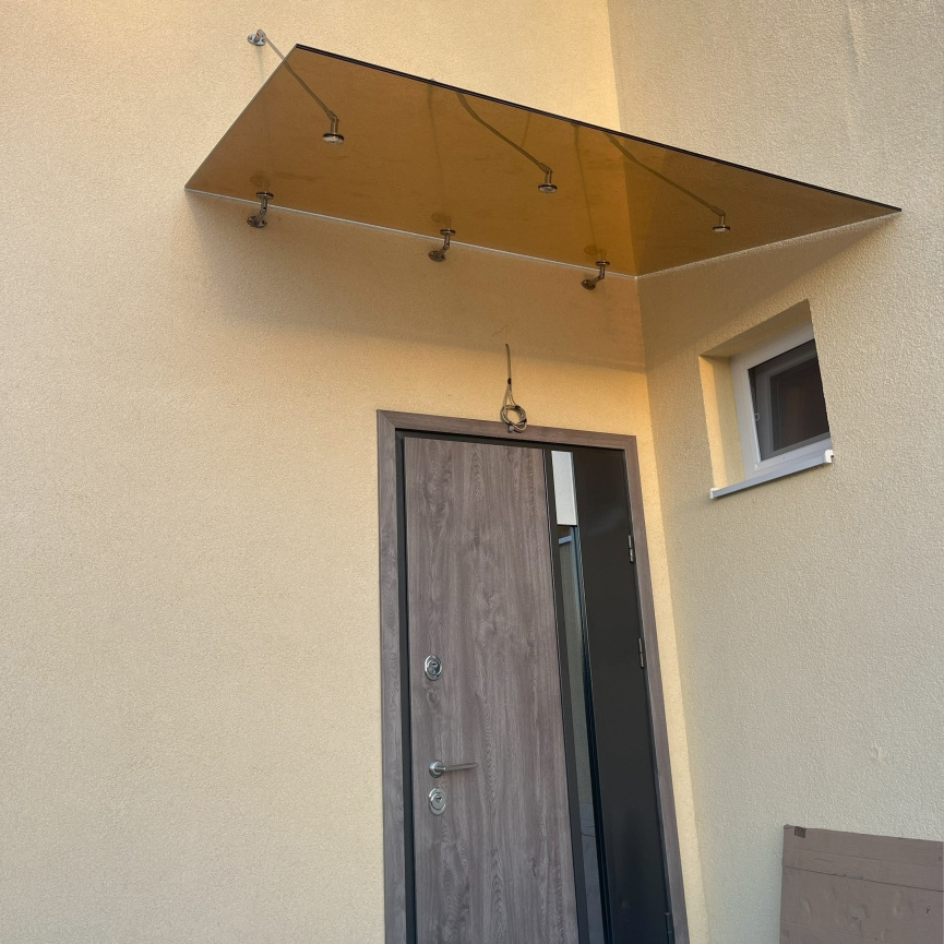 Стеклянный навес над частным домом из бронзового стекла на вантах Nardò — это практичное и визуально тёплое решение для защиты входной зоны. Бронзовое стекло, тонированное в массе, снижает яркость солнечного света и придаёт фасаду более статусный и дорогой внешний вид.