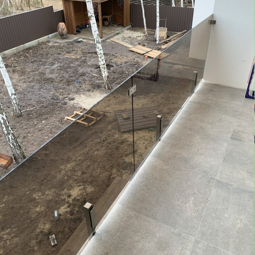 Стекло расположено точно по внешнему краю конструкции, что создаёт эффект "висящего" ограждения и подчёркивает архитектурную линию второго этажа. Бронзовое стекло добавляет интерьеру тёплый оттенок, премиальность и мягку глибину кольору.