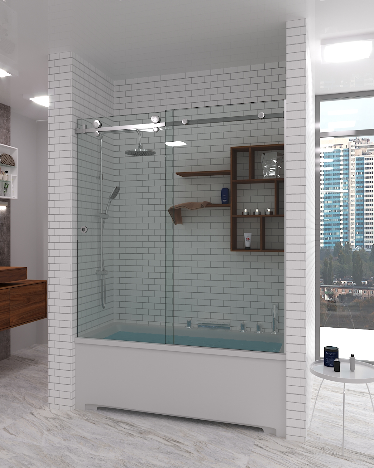 Модель Brighton складається з двох стекол і повністю закриває периметр ванної кімнати. Конструкція такої шторки працює так само, як двері в шафах-купе: одна стулка нерухома, друга розсувна. Завдяки цьому зберігається простір та функціональність.