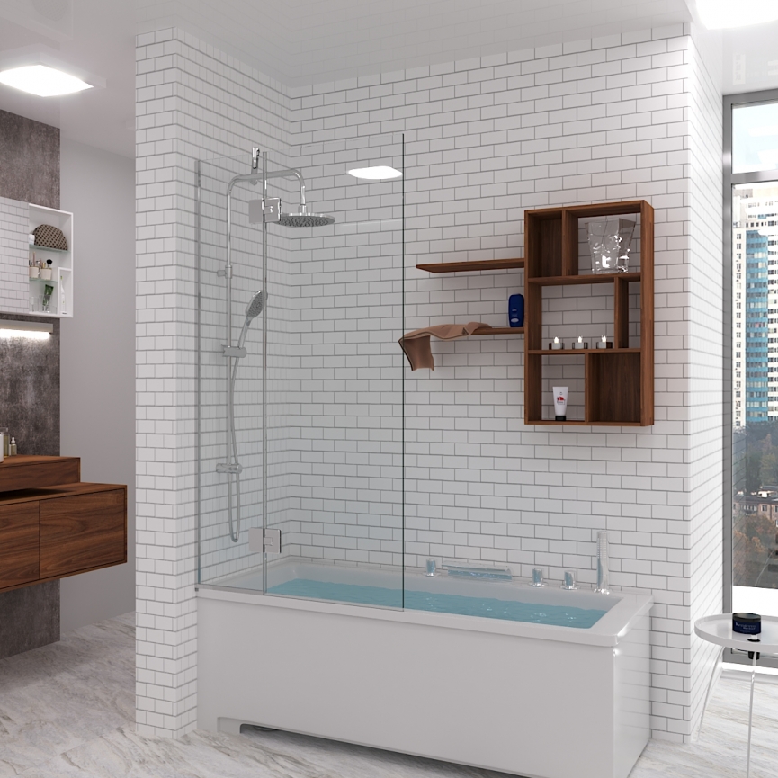 Перегородка Oxford складається із двох скляних полотен. Перше полотно – нерухома конструкція, яка кріпиться до стіни на алюмінієвий профіль та має додаткову штангу жорсткості, що робить її надійнішою. Друге полотно – це розстібні двері з ущільнювачем, що запобігає попаданню бризок води на поверхні та підлогу у ванній. Така конструкція дуже зручна і функціональна, адже за потреби, наприклад, коли купаєте дитину, можете відкрити одну стулку, а коли приймаєте душ – закрити.