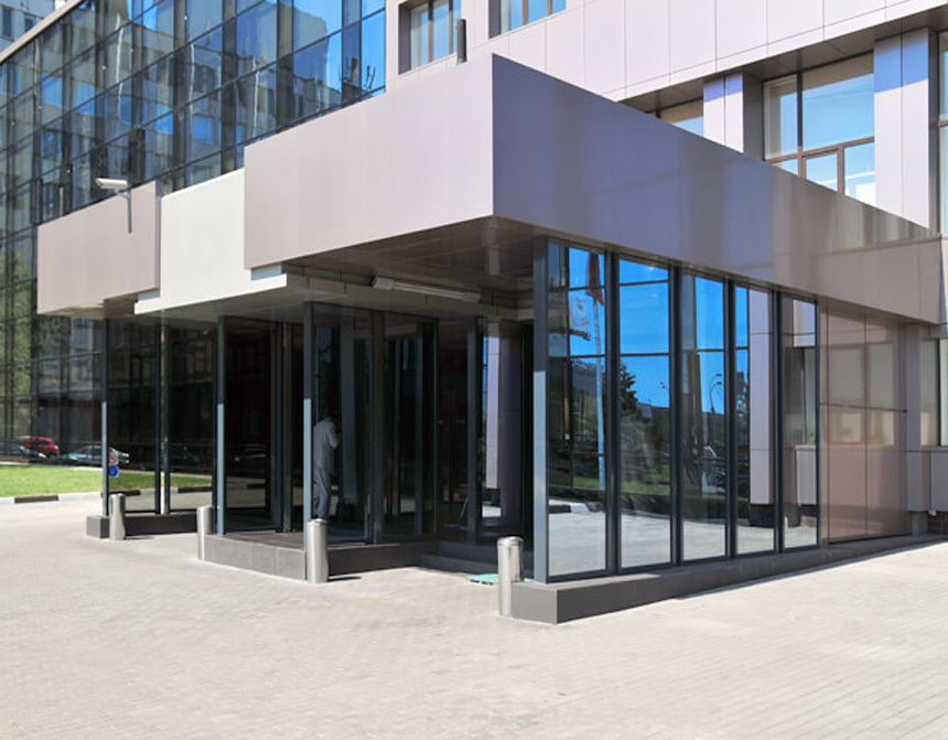 01. Сучасна офісна будівля або торговий комплекс просто неможливо уявити без такого елемента, як вхідні групи. Це справжня візитна картка будь-якої компанії. Справді гарний та якісно виконаний даний архітектурний елемент здатний залучити нових клієнтів та прикрасити фасад будівлі.